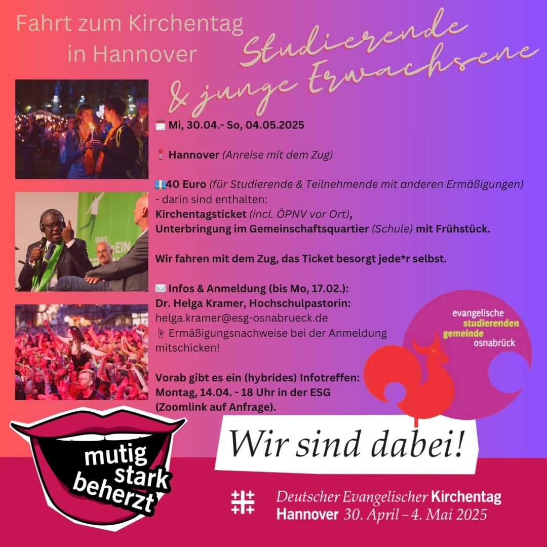 "MUTIG, STARK, BEHERZT" - unter diesem Motto steht der Evangelische Kirchentag 2025 in Hannover. Er ist ein buntes Glaubens-, Kultur- und Musikfestival, eine Plattform für kritische Debatten, bei denen vielfältige Perspektiven zu Wort und zu Gehör kommen, und ein einzigartiger Anlass, Gemeinschaft zu erleben. Hast du Lust dabei zu sein? Termin: Mi, 30.4. - So, 4.5.2025 Kosten: 40 Euro für Studierende, 90 Euro für Teilnehmende ohne Ermäßigung (für ÜN im Gemeinschaftsquartier, Dauerkarte Kirchentag & ÖPNV); die Anreise nach Hannover erfolgt mit dem Zug (mit Semesterticket bzw. auf eigene Kosten); Infos & Anmeldung (bis 17.2.): helga.kramer@esg-osnabrueck.de (bitte ggf. Ermäßigungsnachweis mitschicken + Angabe des Alters) Weitere Infos zum Kirchentag sind zu finden auf @kirchentag oder kirchentag.de!